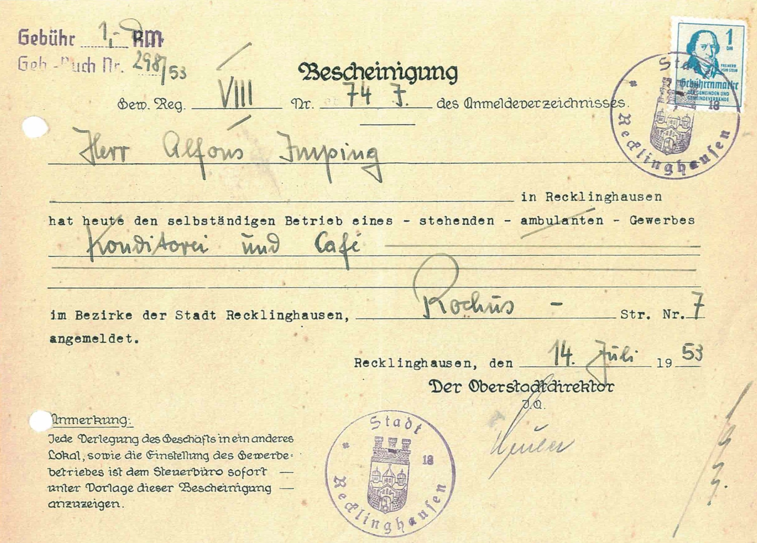 Den Grundstein zum Erfolg der heutigen Confiserie Imping legten Alfons und Imgard Imping 1953 mit einem Konditorei Café in der Rochusstraße in Recklinghausen. Schon damals legten die Gründer höchsten Wert auf ausgesuchte Rohstoffe und oberste Qualitätsstufen zur Herstellung ihrer Spezialitäten.